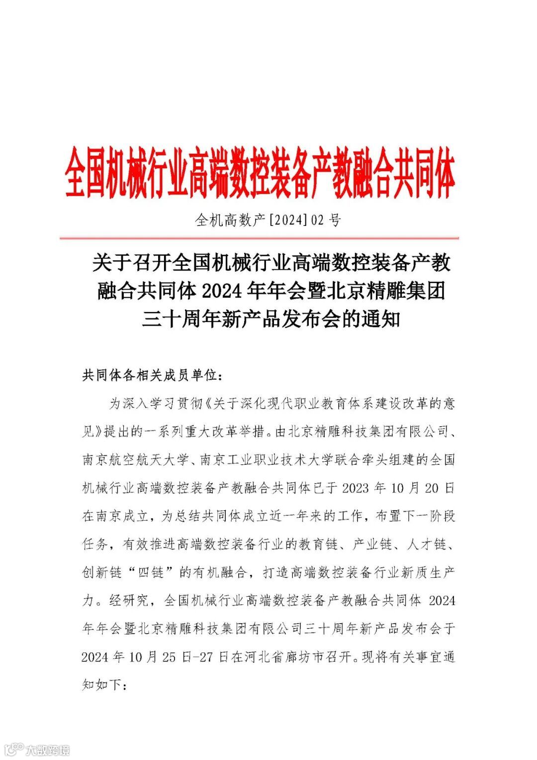 关于召开全国机械行业高端数控装备产教融合共同体2024年年会暨北京精雕集团三十周年新产品发布会的通知