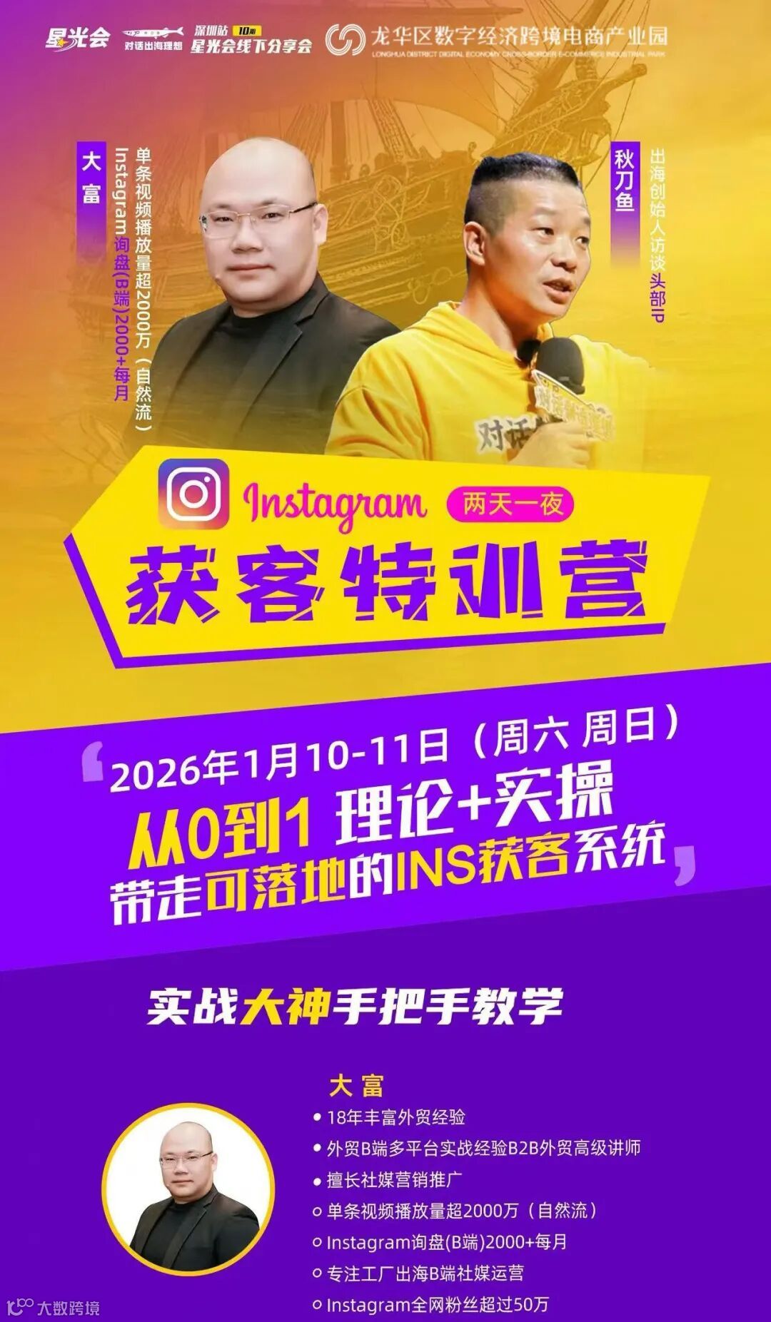 特训营摒弃了传统的单向灌输模式,采用 “讲解-演示-实操-答疑” 的高强度闭环学习法。秋刀鱼老师和大富老师将其18年外贸经验与月询盘2000+ 的Instagram实战方法论,拆解为清晰的步骤和可复制的模板。从账号的精准定位与差异化搭建,到内容策略、爆款视频创作心法,再到高阶的引流转化与数据复盘,知识密度极高。