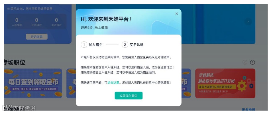 ②登录后,需要点击弹窗提示的【立即加入猎企】。