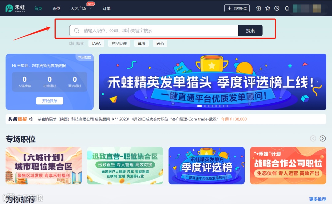 登录禾蛙官网(hewa.cn),在首页搜索栏输入“发单顾问昵称”,即可查询顾问当前运营职位、一键对接顾问!