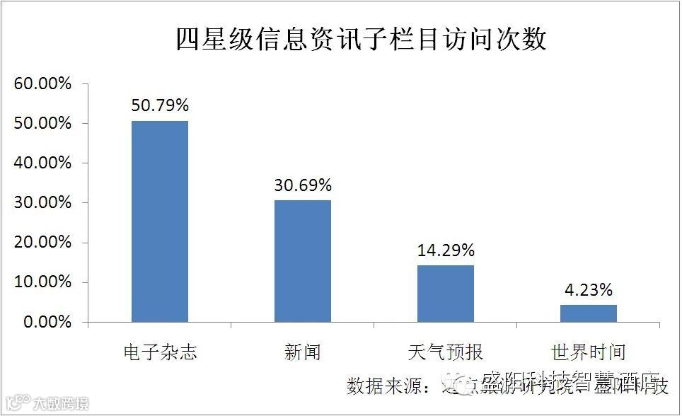 从信息资讯子栏目的访问次数来看,电子杂志以50.79%的占比高居榜首,新闻、天气预报、世界时间分别以30.69%、14.29%、4.23%排名二到四位。