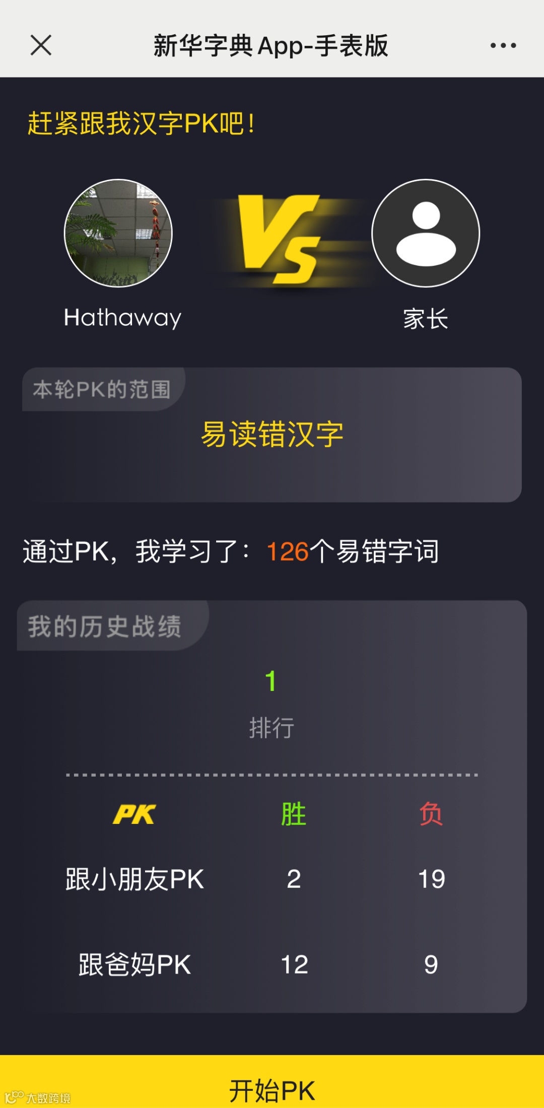 不仅能在线和其他小朋友pk,成绩计入全国排行榜,在家还能和父母pk,进行亲子互动,一部手机+一个手表,大人孩子一起学,看看谁知道得更多?