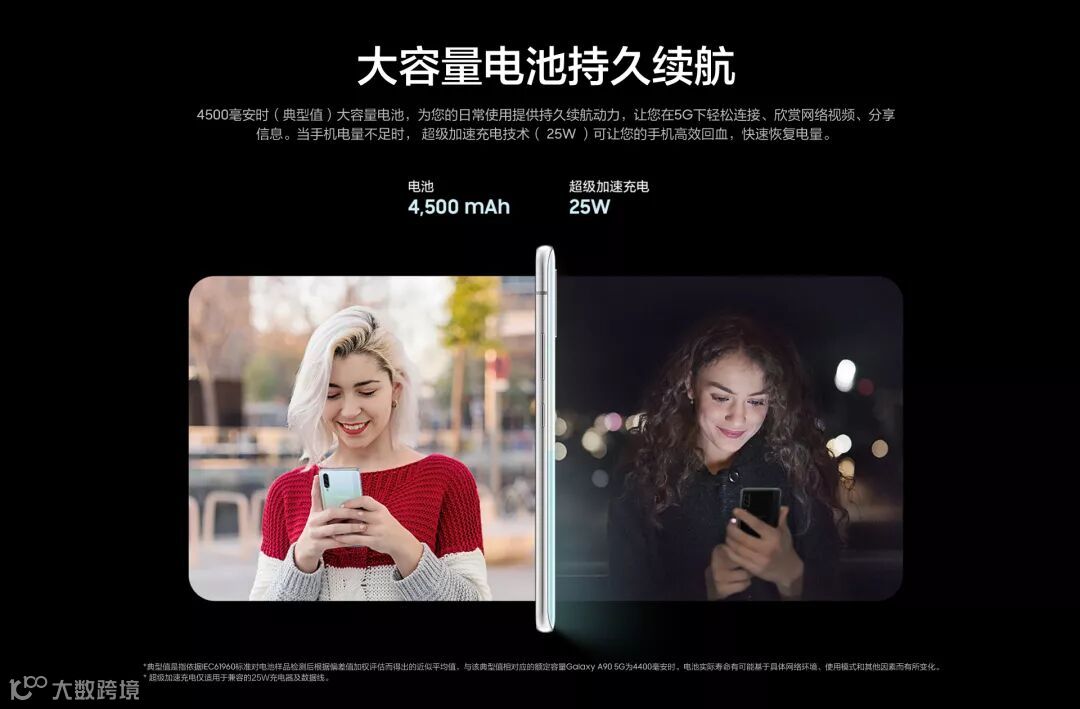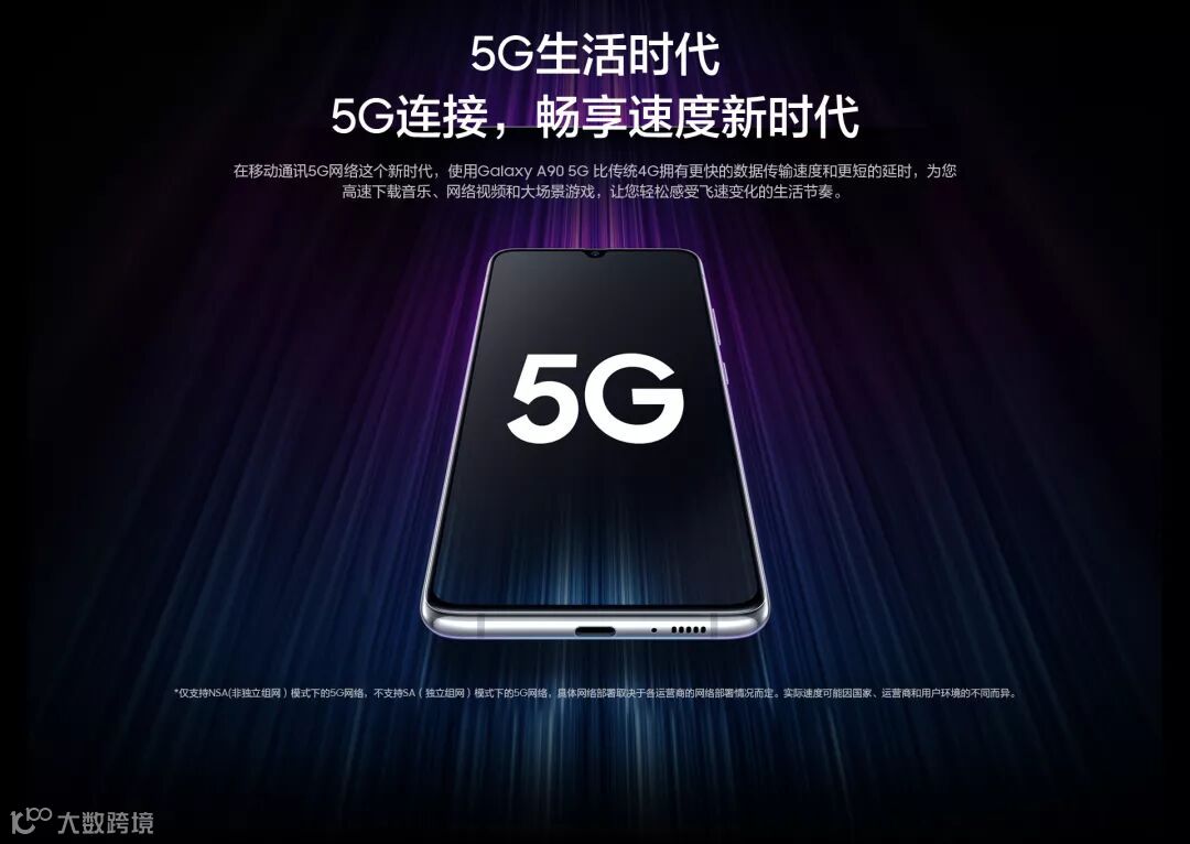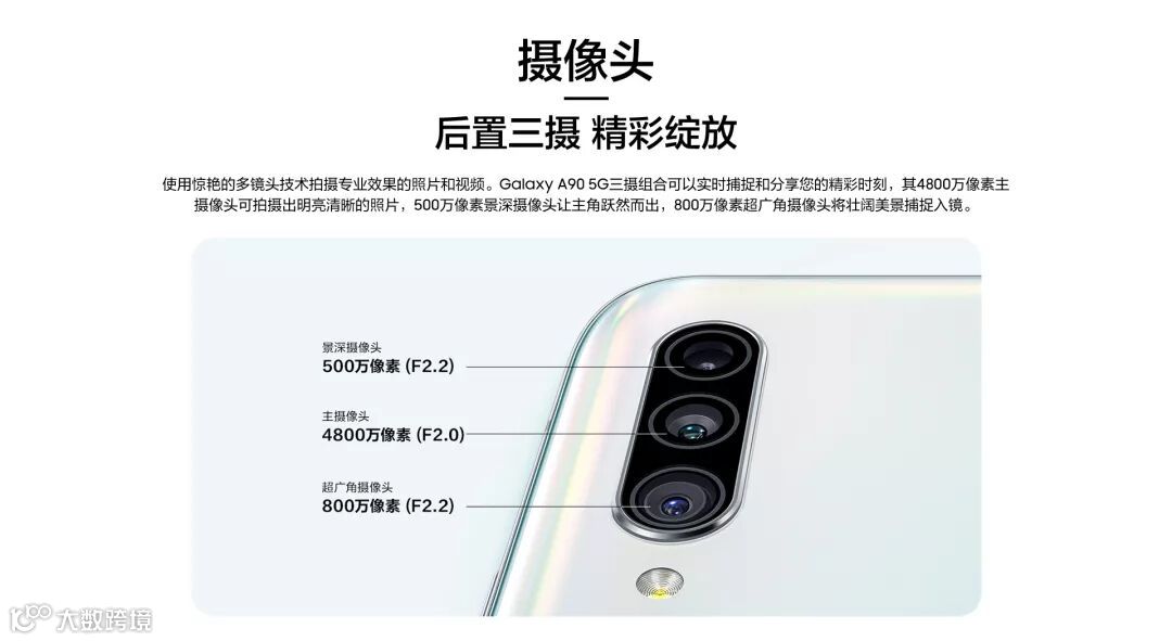 三星Galaxy A90 5G在配置上采用6.7英寸1080P Super AMOLED水滴屏,骁龙855+X50 5G基带,支持5G NSA网络以及向下兼容4G、3G、2G网络,UFS 3.0闪存,光学屏幕指纹识别。