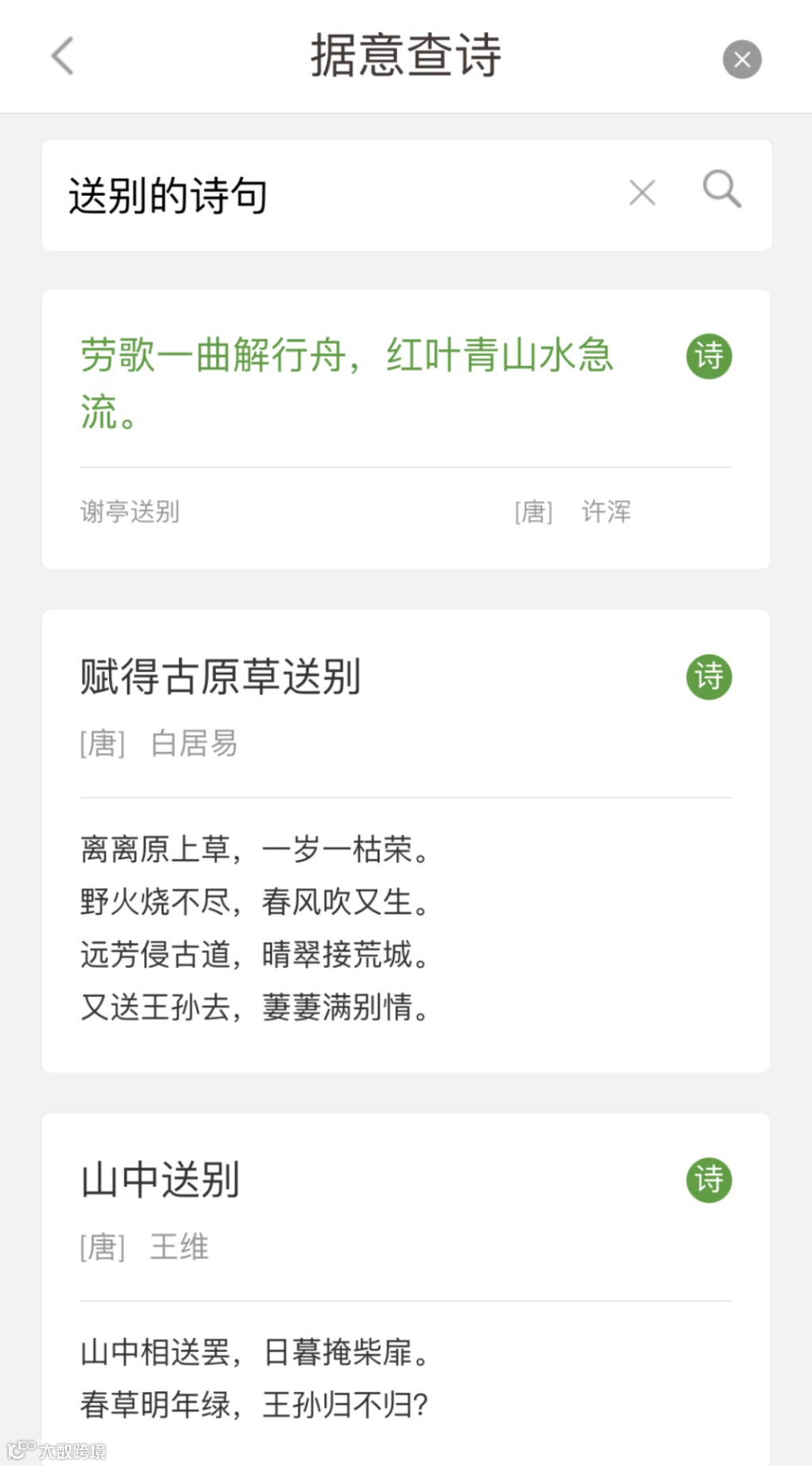 同样地,通过据意查诗功能,我们也可以在涵芬App中找到合适的诗句来丰富表达、润色我们的文章作品。
