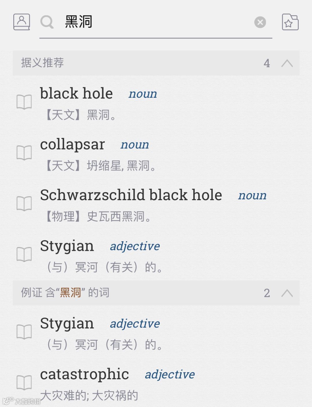 在《新世纪英汉汉英大词典》APP里同样输入“黑洞”一词,与牛津词典稍有区别,这款词典给出的建议词如下。