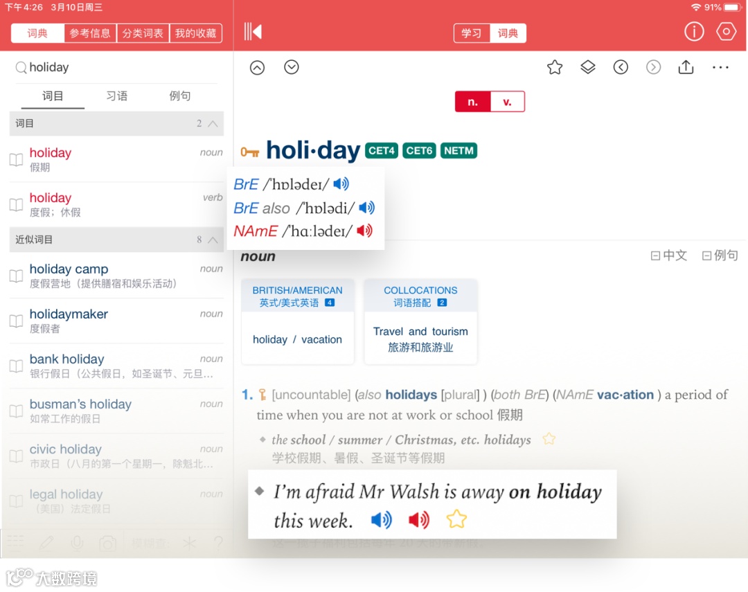 《牛津高阶英汉双解词典》APP提供单词和例句的英式、美式两种对比发音,满足不同人群的学习需求。