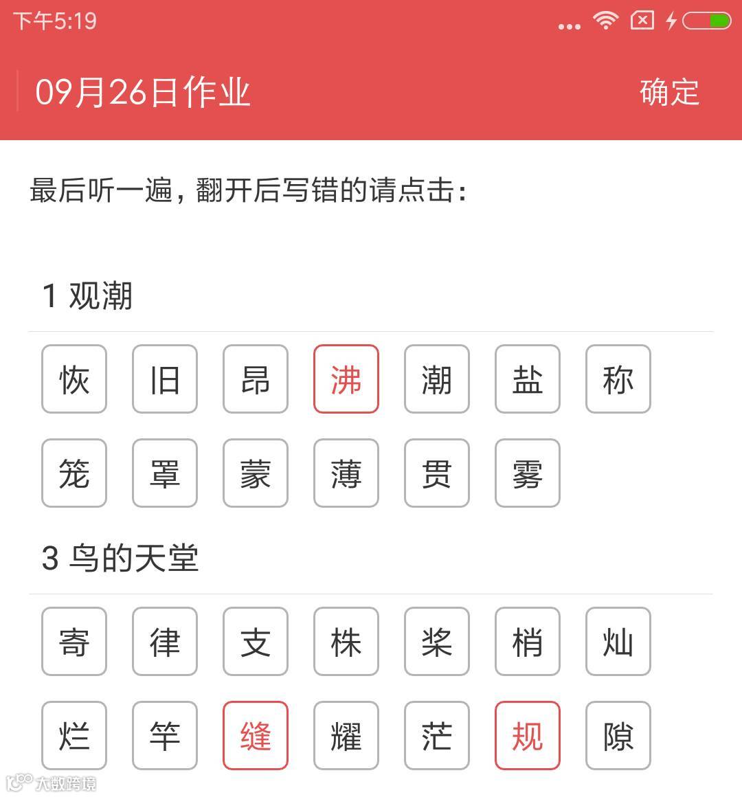 当日听写作业完成后,屏幕上会依次显示正确答案,听写者对照自己写下的内容进行批改,如有书写错误的可点击标红,系统会将其收录进错题集,以供之后复习巩固。