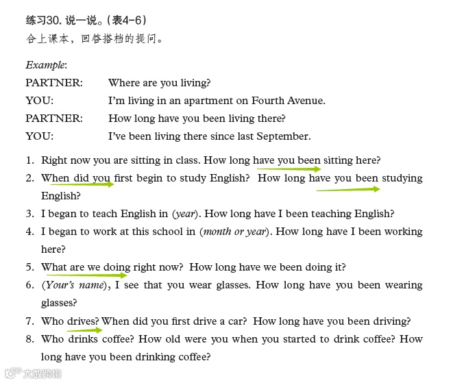 而这个练习提供了我们平时会话的语境,利用现在进行时、现在完成进行时、一般现在时和一般过去时等多种时态的组合运用让学习者来练习。