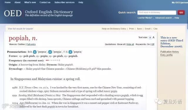 大家或许有所不知,这个美食有个英文名字popiah,是个借自闽南语的词汇,汉字写成“薄饼”。英语世界最大、最权威的《牛津英语词典》(Oxford English Dictionary,简称OED)有收,简单把它定义为a spring roll(一种春卷),说是出现于新加坡和马来西亚的菜肴(in Singaporean and Malaysian cuisine)。