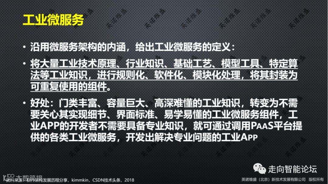 这就是该图所强调的主题,也是创建工业APP的具体路径:传统软件结构-微服务池-调用-工业APP-面向具体场景、不限时空的工业服务。这种新型的工业服务,将为“结果经济”提供强大而坚实的平台基础。