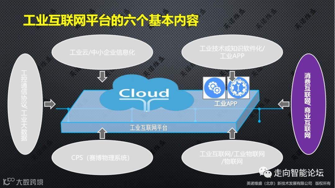 图的中心部分是工业互联网平台,周边围绕的是工业互联网/工业物联网/物联网、CPS(赛博物理系统)、工控通信协议/工业大数据、消费互联网/商业互联网、工业云/中小企业信息化、工业技术或知识软件化/工业APP这六大基本要素。