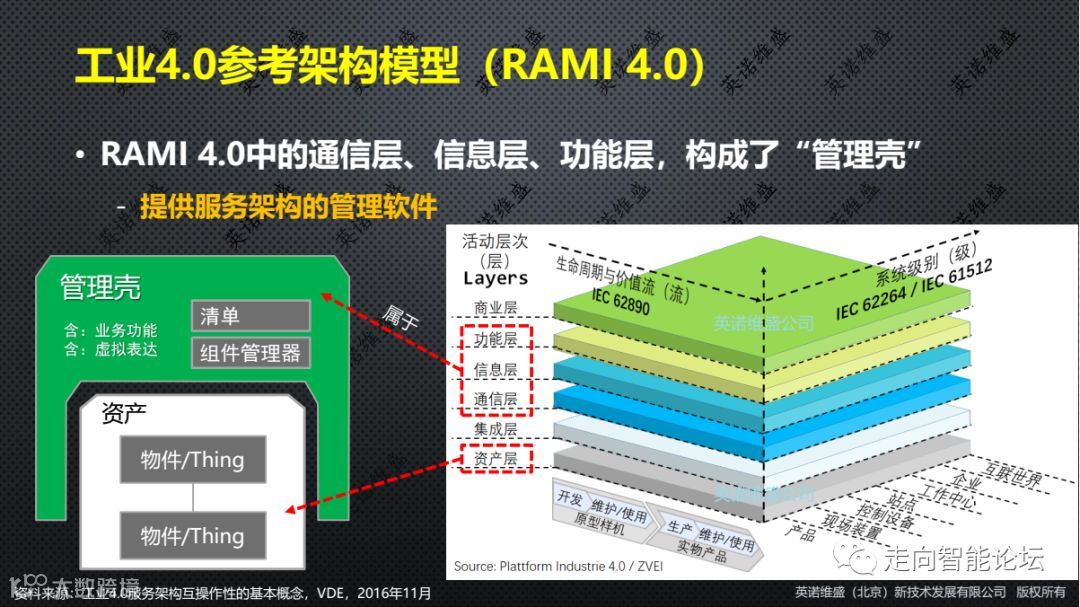 在德国ZVEI提出的“平台工业4.0”标准中,给出了“工业4.0参考架构模型(RAMI 4.0)”,其中的资产层,是指企业的所有“物件(Thing)”,而通信层、信息层、功能层,则共同构成了“管理壳”,形成一种提供服务架构的管理软件。两者之间的集成层,成为了物理系统与赛博系统的融合层。由此,当常规的“物”,按照RAMI 4.0的规定与步骤加上管理壳之后,就形成了多种种级别的CPS。一个智能工厂与外界智能工厂的互联,将形成“互联世界”。由此,从工业物联网的视角,有效地管理、配置与优化企业的各种资产。