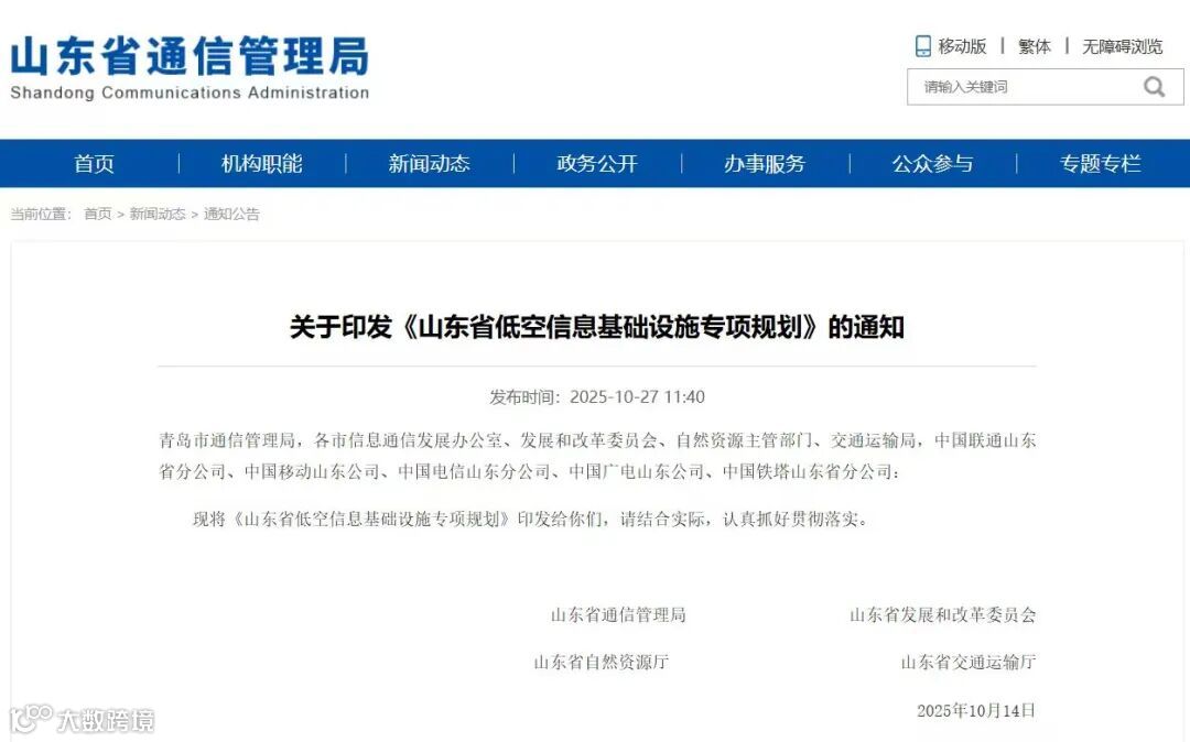 10月27日,山东省通信管理局联合山东省发展改革委、山东省自然资源厅、山东省交通运输厅印发《山东省低空信息基础设施专项规划》。这是全国首个省级低空信息基础设施专项规划。