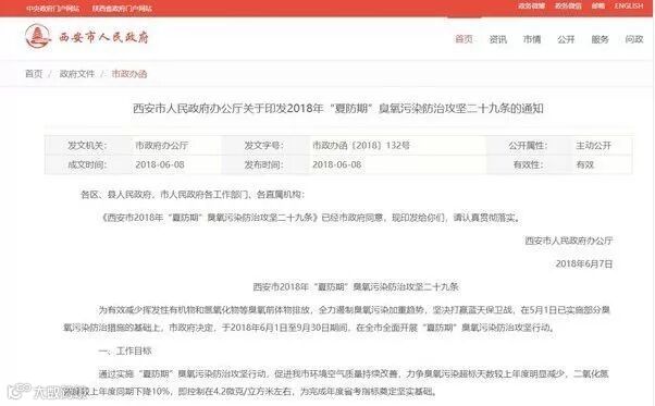 西安市政府办公厅印发了《西安市2018年“夏防期”臭氧污染防治攻坚二十九条》。在5月1日已实施部分臭氧污染防治措施的基础上,西安市政府决定,于2018年6月1日至9月30日期间,在全市全面开展“夏防期”臭氧污染防治攻坚行动。