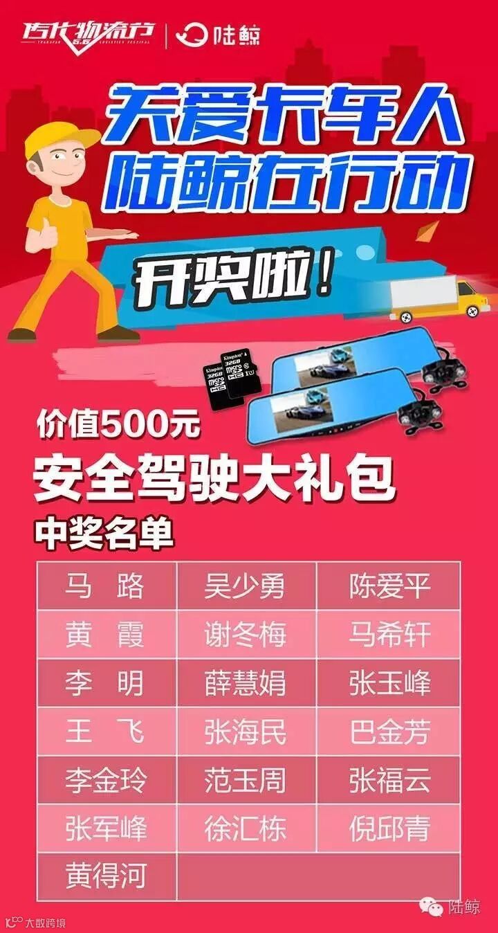 各位亲爱的卡友卡嫂们,上期“关爱卡车人,陆鲸在行动”活动的获奖名单火热出炉了,恭喜中奖的卡友卡嫂们!赶紧看看中奖名单有没有你哦!