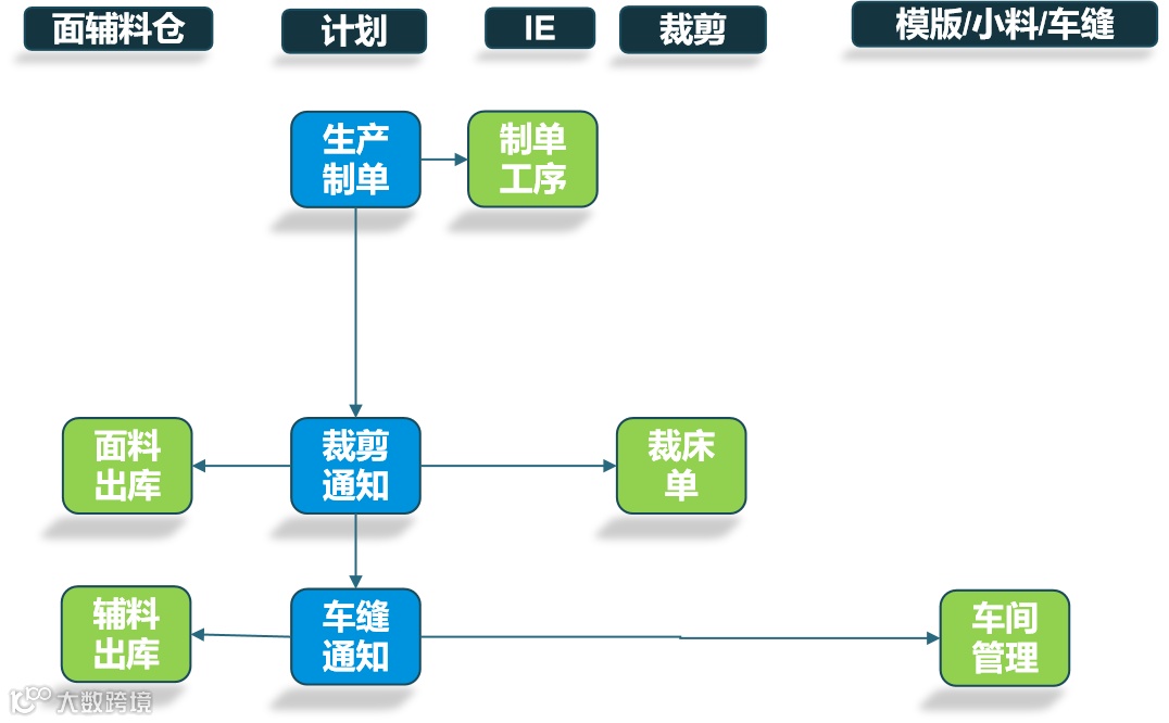 ●计划部手工录入总部下达的生产制单 ●人工结合物料齐套情况,开裁剪通知 ●结合裁剪、辅料情况,开车缝通知 |