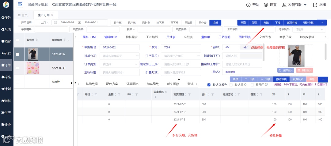 ●大货订单变更时支持数量变更、交期变更、拆分交期等快捷操作;后期无需删除后续订单数据,可以实现快速变更 ●订单数量变更后,会更新物料需求(MRP),下发采购,已采购的物料可及时跟供应商协商减数或者补数采购 |