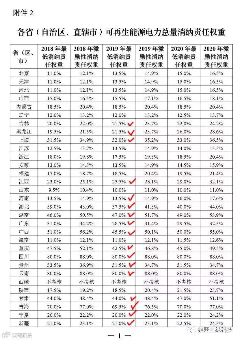 从附件权重的表格中,可以看出吉林、黑龙江、上海、江西、河南、湖北、湖南、广东、广西、重庆、四川、贵州、云南、甘肃、青海、宁夏、新疆的可再生电力消纳责任权重超过20%,说明这些省市在2019年对光电、水电、风电等清洁能源的消纳指标较高。