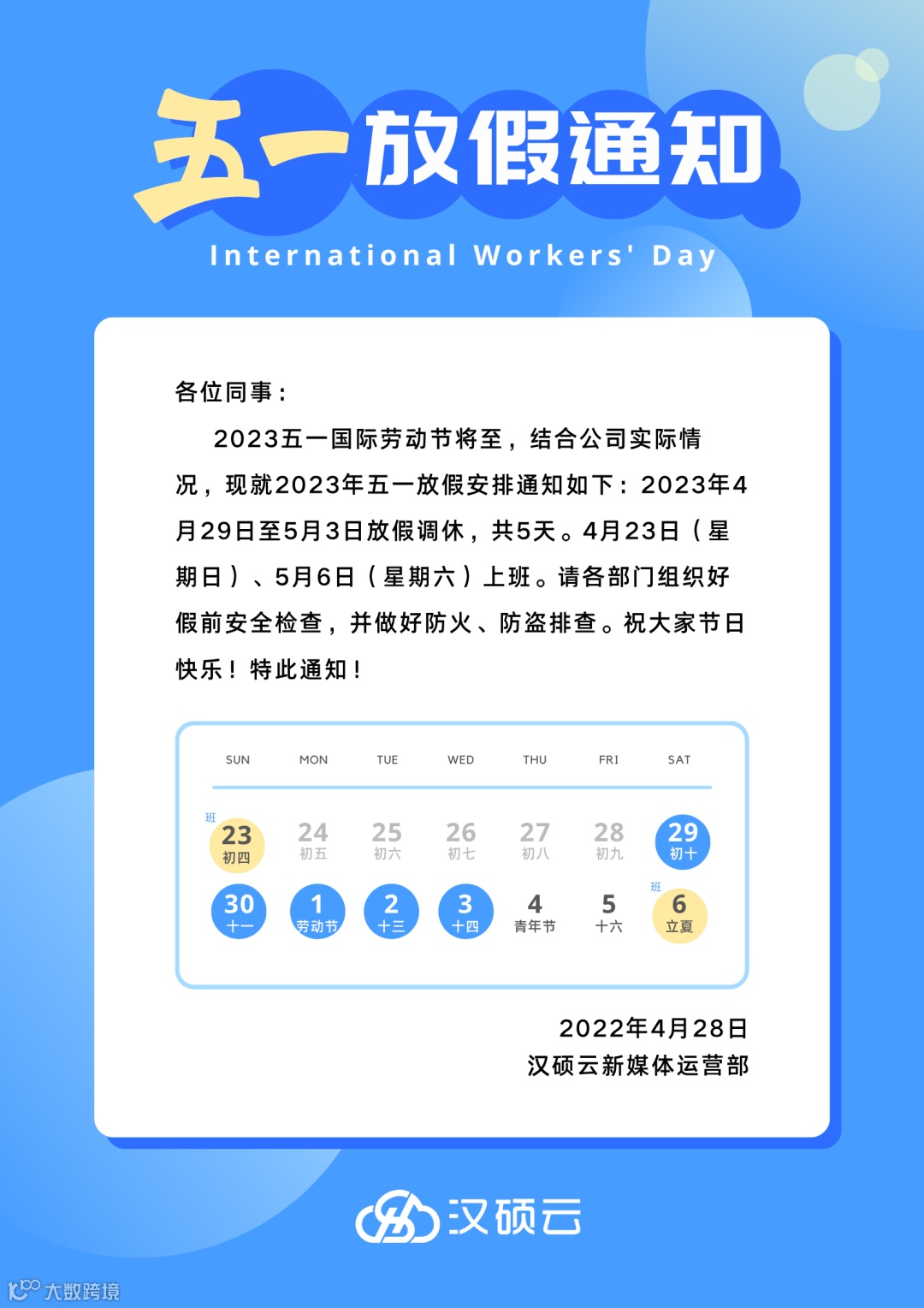 导读:汉硕云科技五一劳动节放假通知安排 | 预祝全体员工过一个充实且丰富的五一假期生活!
