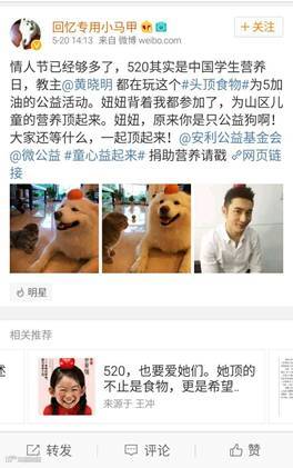 好玩的公益活动不仅会吸引90后的年轻人,微博上各路大V也纷纷参与进来,黄晓明也发出微博,第一时间参与了这股头顶食物的风潮。