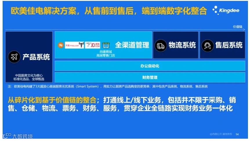 欧美佳电基于金蝶云·星空平台,搭建了一体化信息化平台,集团模式下进行基础资料、业务流程、核算政策的整体规划;建立全渠道应用平台、管易云电商管理平台、实现与经销商集成,电商平台数据集成、链接400呼叫中心,实现从售前到售后全链路打通,连接企业上下游,确保服务及时。统一流程审批入口、云之家+云星空应用提升管理透明,全业务组织库存一体化应用,全局条码管理贯穿建设构建企业智能化仓储系统,一体化的信息平台建设为企业快速响应市场变化,掌握企业全局数据做积淀。