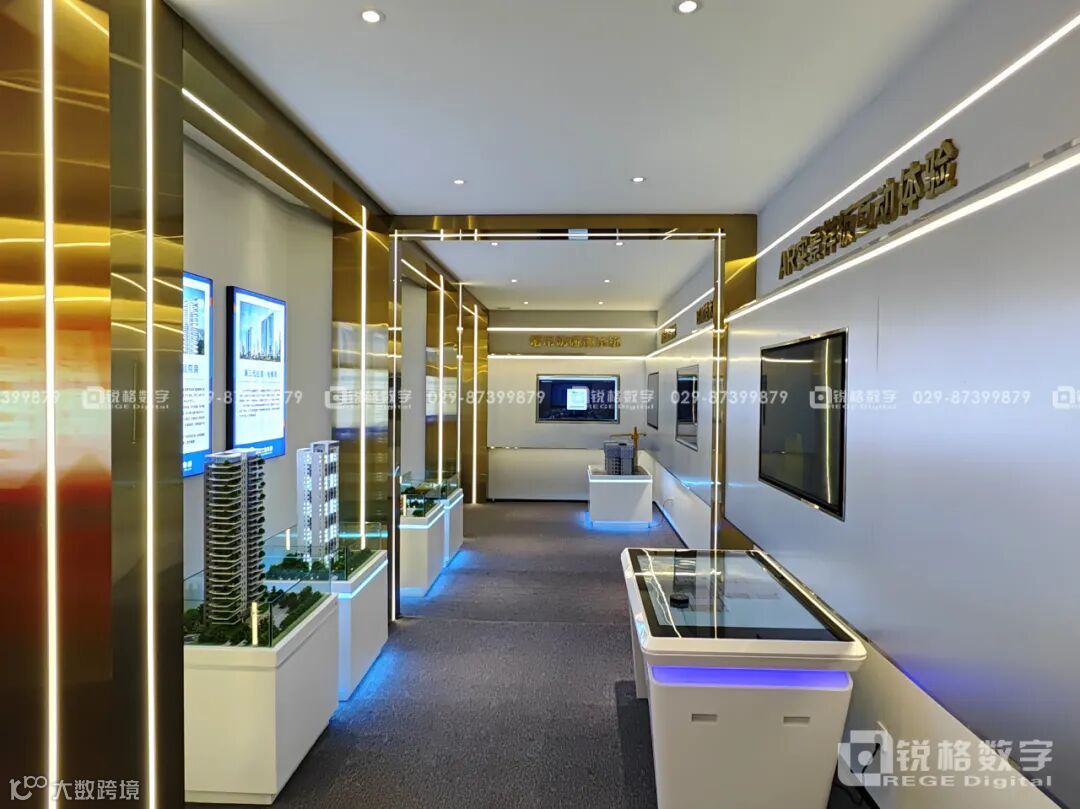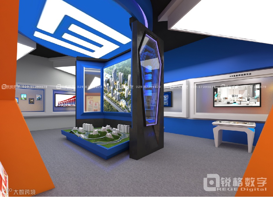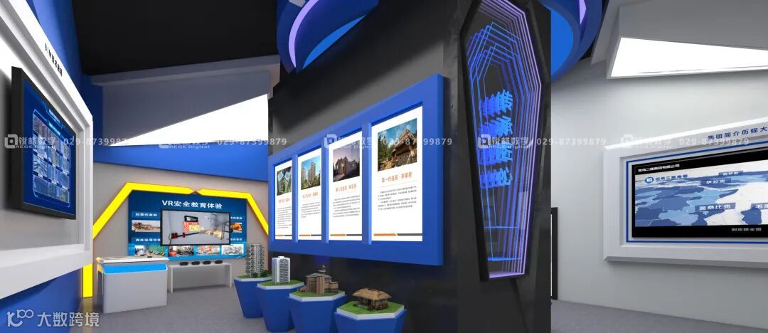 吊顶采用天圆地方造型结构,整面隔墙的部分不封顶,流出气口,使得整个展厅的气场更加宏伟,其他部位的吊顶结构,采用几何切割面去表达,用建筑的张力彰显企业力量与实力。