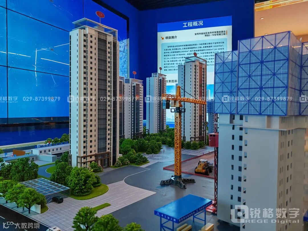 三个时态通过动态演绎实景,将建设全过程呈现在眼前。包含塔吊,工程车、建筑升降电梯,以及交付使用后的外立面的亮化灯光。