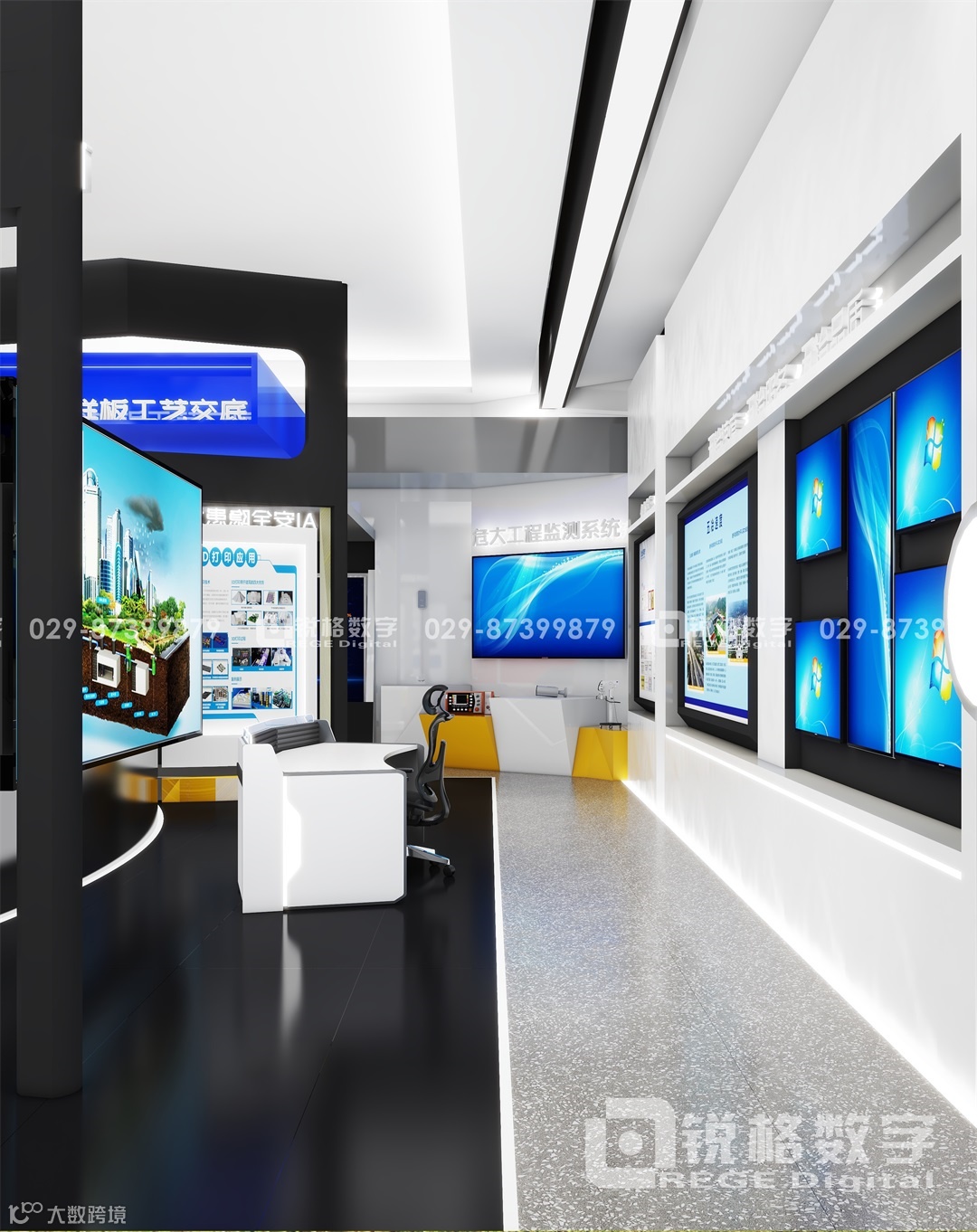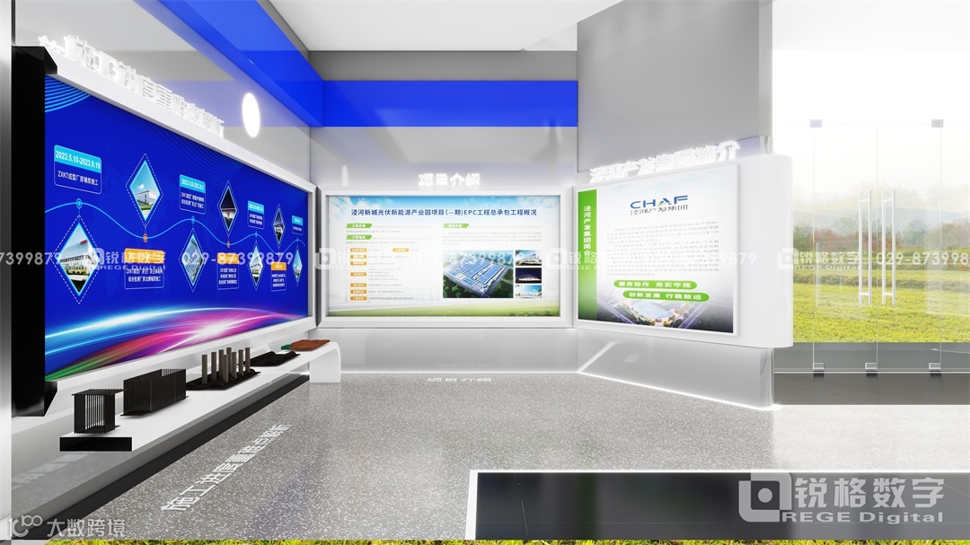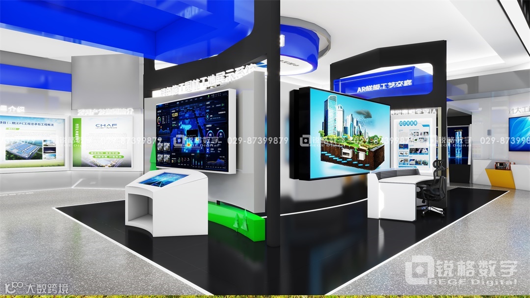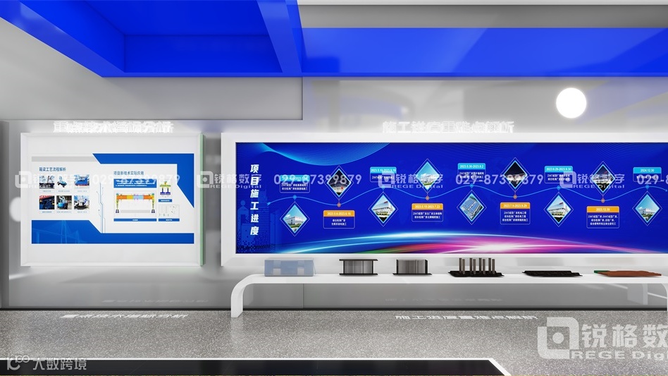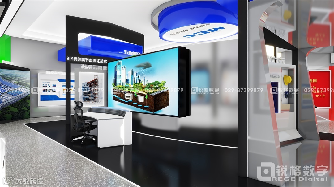 本案第一视觉爆点所在,顶部采用套色叠级正圆造型,对应地面沙盘装置,形成天圆地方之能量格局。沙盘正面墙体设置全彩高清LED宽幕,直观展示项目智慧建造平台,实时动态数据场景。上方从两侧墙面分别伸出几何立方蓝色体块。表达出建设过程中的对接、合力、突破和孪生概念。同时巧妙的为下一展区提供导视标题位置,增强科技即视感。