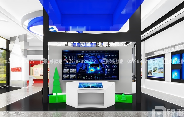 与其相对的是绿色施工园林工地展示系统,利用AR交互飞屏系统,辅以3D建模动画技术,展示项目海绵城市环保施工措施及概念。