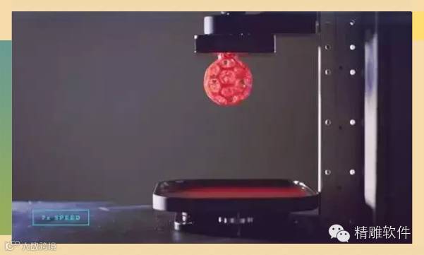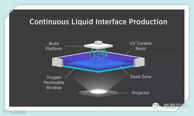 现有的3D打印方法是利用液态树脂,一层层地构筑物体结构,过程缓慢。先打印一层,矫正外形,再灌入树脂,重复之前的步骤。而在CLIP系统中,一个投影设备会连续不断地,用紫外线从下方无形地切割出物体剖面。这种光能让一池子的液体树脂的底部一层硬化,与此同时会有一个平台把已经成型的物体从树脂池中抬起来。