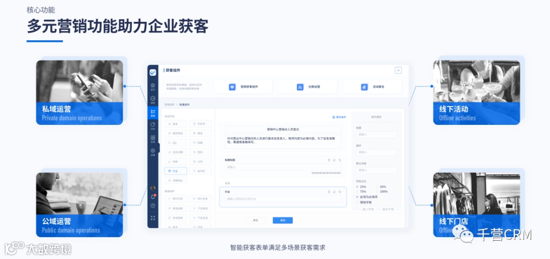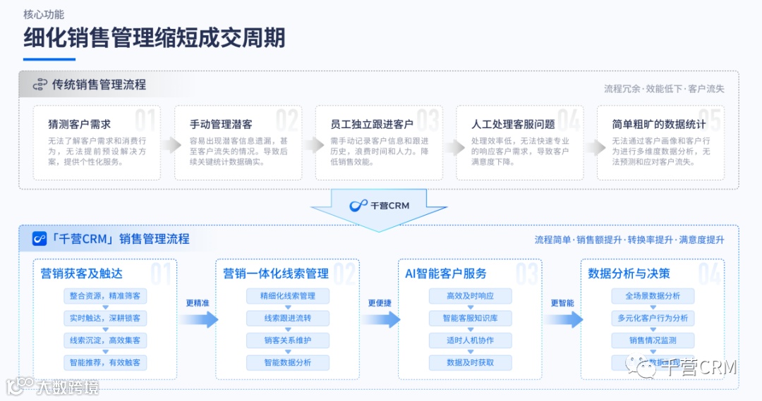 具体分析千营CRM在客户管理、销售跟进、操作简单、使用成本低、营销获客、智能分析、企业管理、精准转化等方面适合中小微企业的优势;