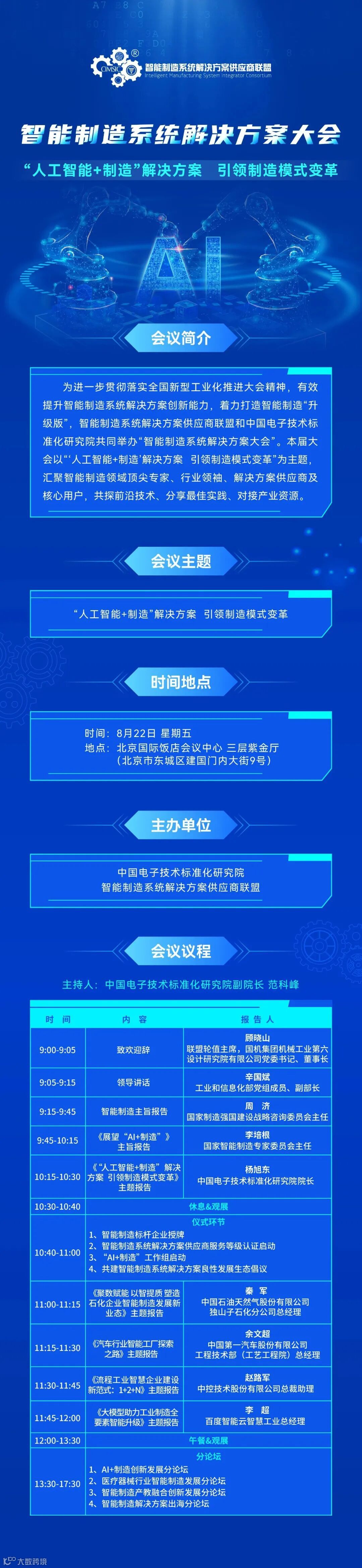 为进一步贯彻落实全国新型工业化推进大会精神,有效提升智能制造系统解决方案创新能力,着力打造智能制造“升级版”, “智能制造系统解决方案大会”将于8月22日在北京国际饭店会议中心举办。本届大会由智能制造系统解决方案供应商联盟和中国电子技术标准化研究院主办,以“'人工智能+制造’解决方案引领制造模式变革”为主题,汇聚智能制造领域顶尖专家、行业领袖、解决方案供应商及核心用户,共探前沿技术、分享最佳实践、对接产业资源。