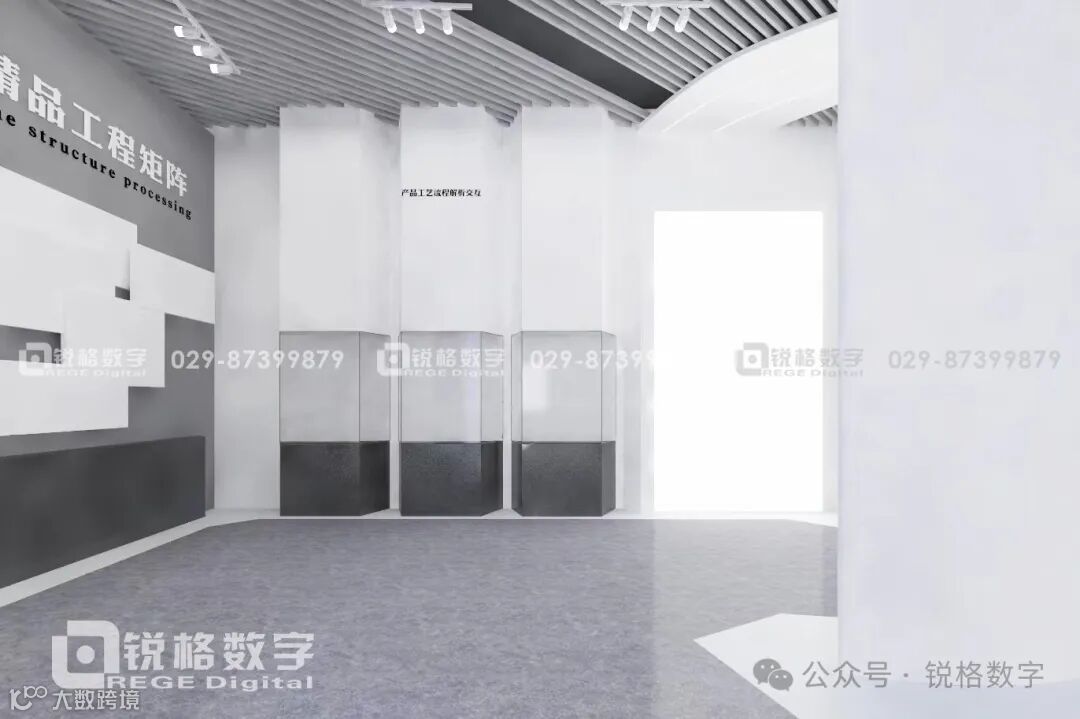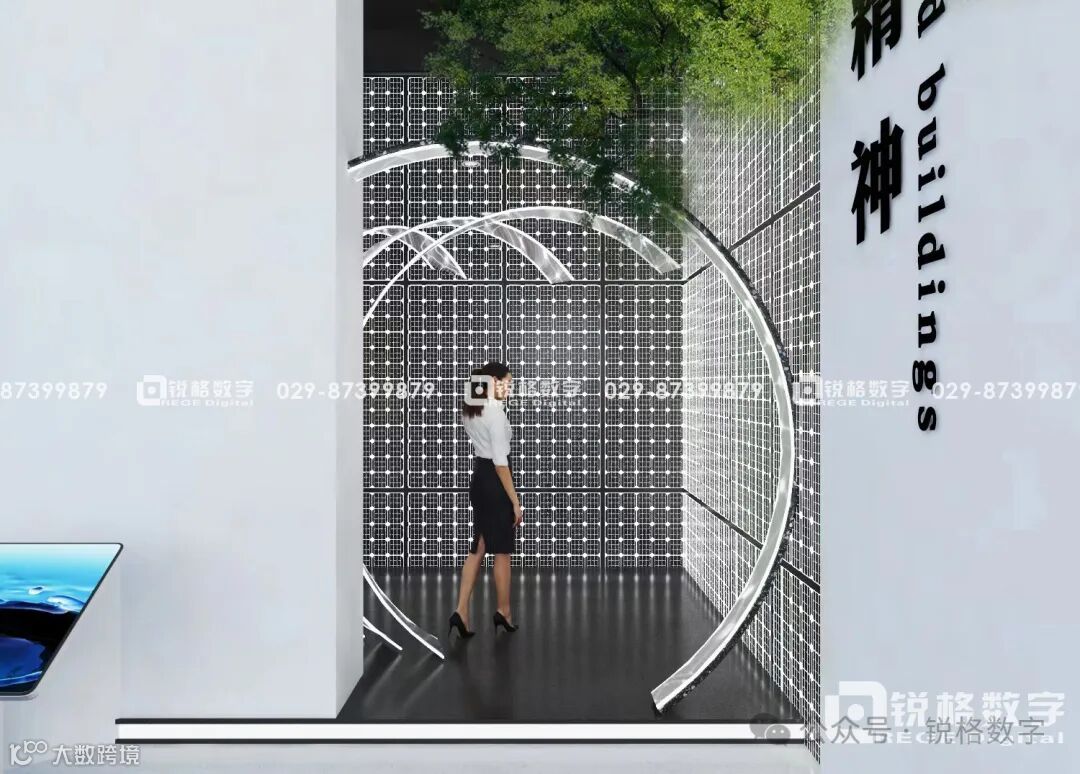 在部分顶面吊装延续至墙面和地面的展示区域,将业主单位的废旧回收电池板演变成饰面结构。既直观的形成光伏电池板的视觉阵列组合打造视觉爆点,又将可持续发展的概念进行引申,将循环利用进行趣味表达,为参访者留下更多的思考。