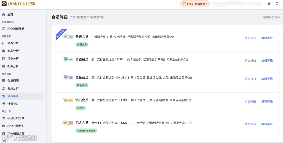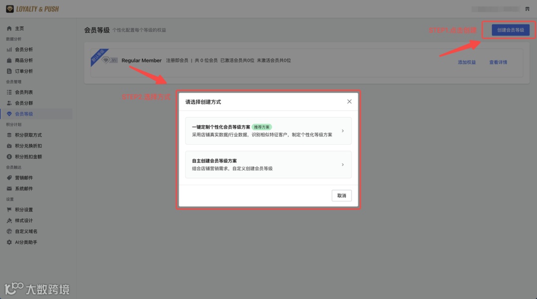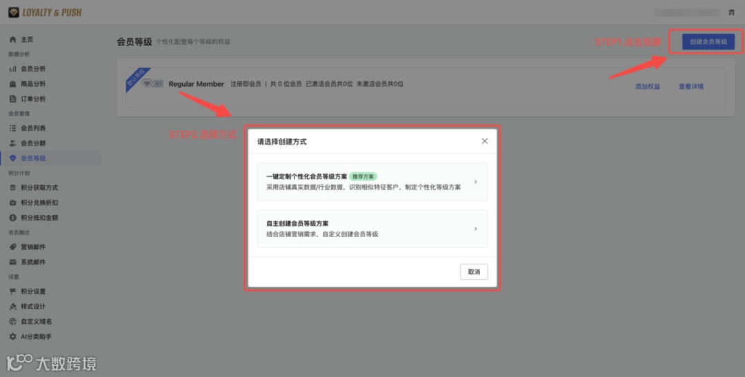 进入【会员等级】→【创建会员等级】,选择“一键定制个性化方案”(基于店铺真实数据与行业基准)或“自主创建”,配置各等级权益与积分规则。