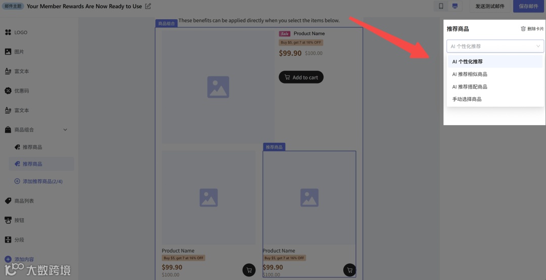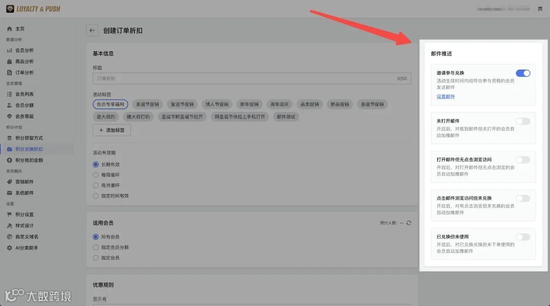 - ⓶ 设置邮件推送:在【积分兑换折扣】模块创建折扣时,开启场景化推送,选择目标分群并配置AI生成邮件内容,系统自动触发;