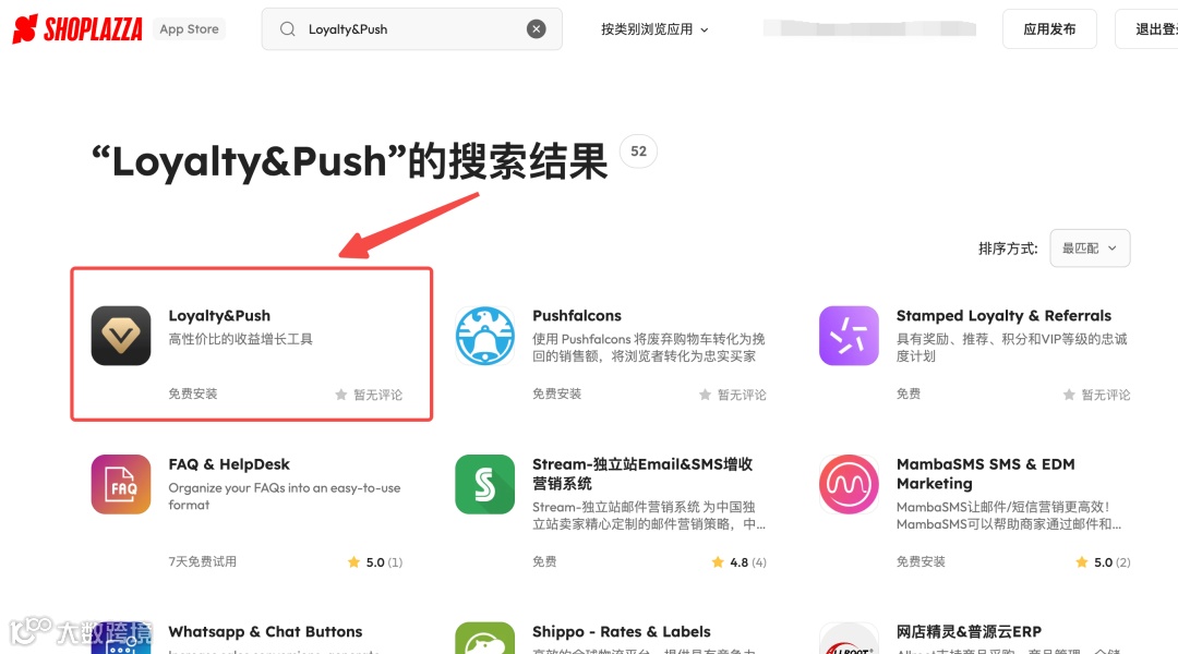 - 点击右上角【访问应用商店】,搜索“Loyalty & Push”,点击【添加应用】完成安装。