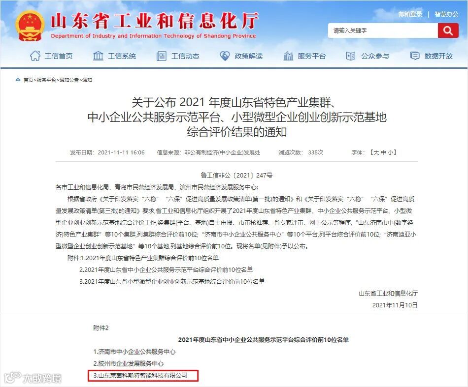 2021年11月11日,山东省工业和信息化厅发布了《关于公布 2021 年度山东省特色产业集群、中小企业公共服务示范平台、小型微型企业创业创新示范基地综合评价结果的通知》。山东莱茵科斯特智能科技有限公司等10家单位,列中小企业公共服务示范平台前10位。