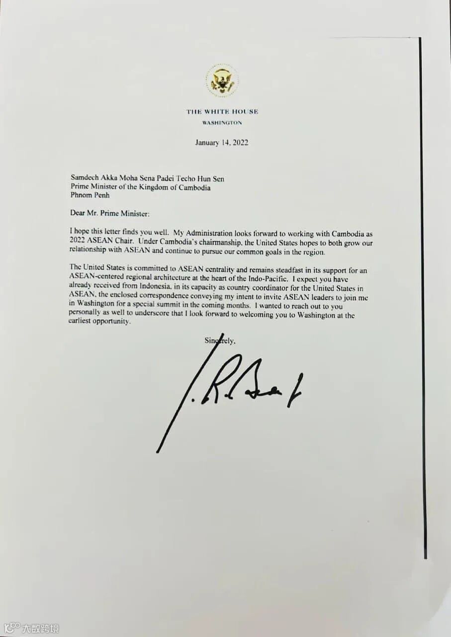 【MGO融媒体讯】近日,美国总统拜登向柬埔寨洪森首相致函,表明欢迎洪森首相出席在华盛顿举行的美国-东盟特别峰会。