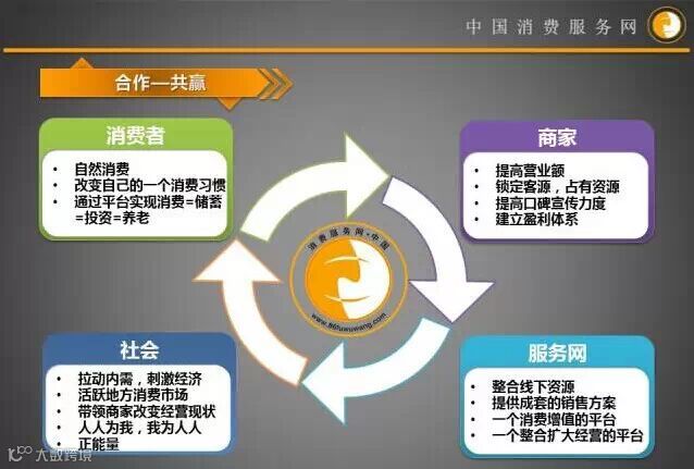 中国消费服务网是一家以互联网为基础,整合360行企业,商家、商品资源为消费者免费提供4大增值服务和创业机会的综合性电子商务服务平台,打造全球最具领导性的商业模式----21世纪终极营销模式,暨:(自然消费=储蓄=投资=养老)