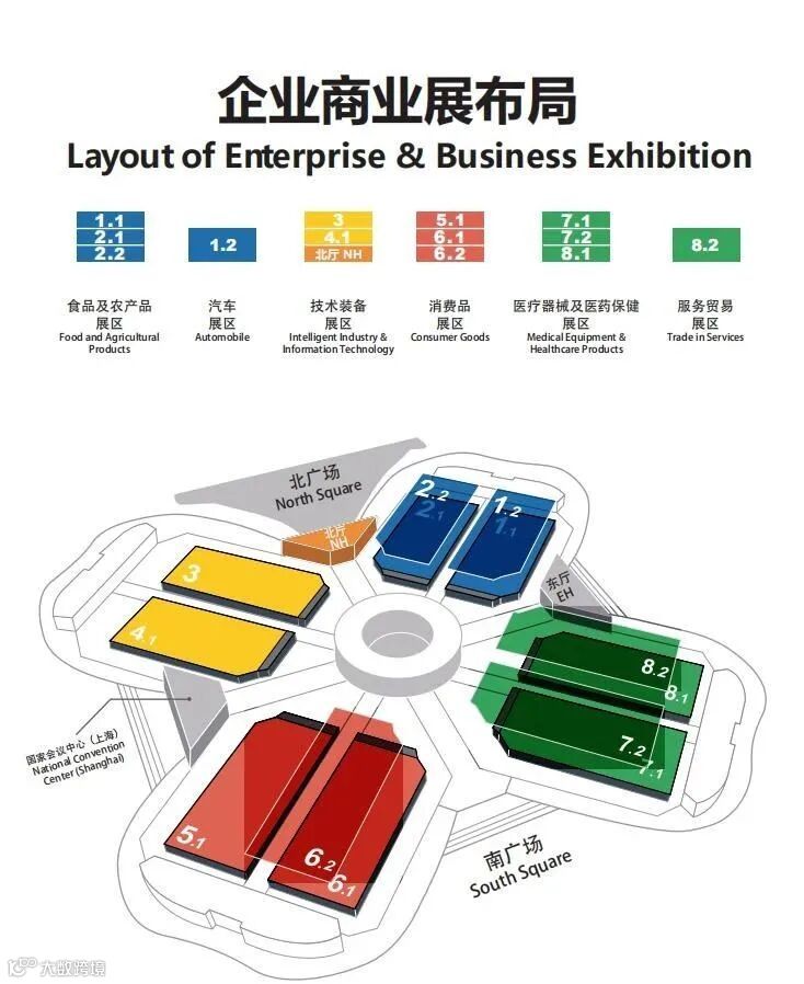 本届进博会企业商业展共设置食品及农产品、汽车、技术装备、消费品、医疗器械及医药保健、服务贸易六大展区。另外,结合全球热点和行业发展趋势,新设公共卫生防疫专区、节能环保专区、智慧出行专区和体育用品及赛事专区四大专区。