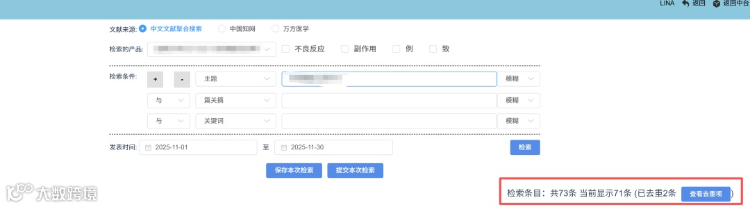 自动识别并剔除重复文献,支持自定义台账编号规则(如按产品/时间/风险类型编码),检索结果可直接生成记录,方便溯源。