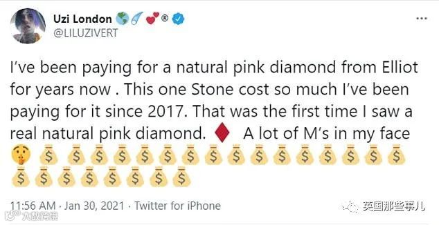 乌兹于1月31日在社交媒体透露,这颗粉钻自2017年首次见到后便一直分期购买,历时三年才付清全款。他表示:“现在我这脸可老值钱了!”据其介绍,这颗钻石的价值超过其所有房产与豪车总和,甚至高于一辆布加迪。
