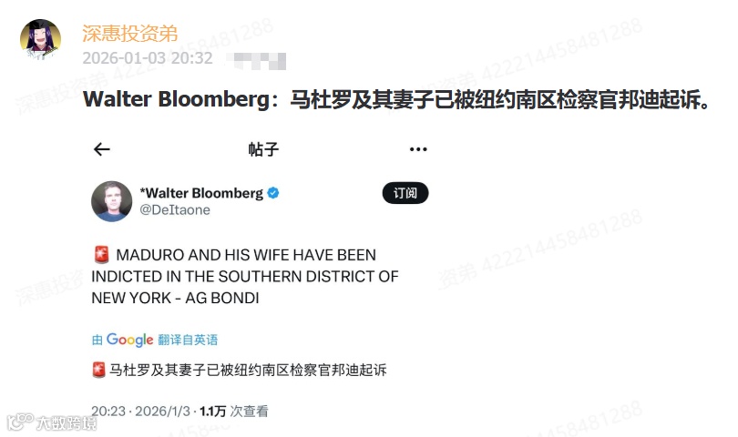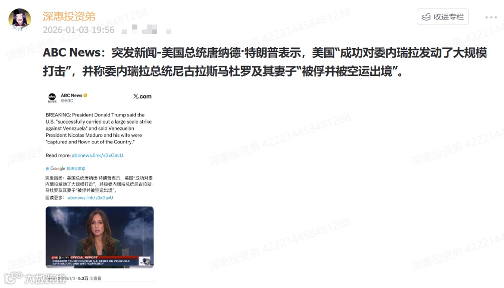 (2)周六(0103),一个主权国家的元首,一天之内轻易被美国跨境抓捕,并迅速移交司法诉讼,简直“千古奇谈”。