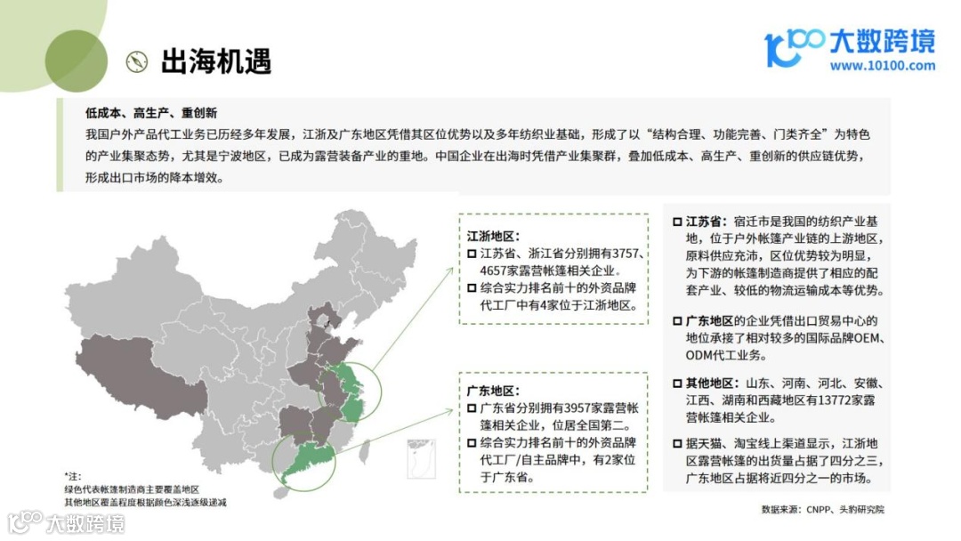 我国户外产品代工业务已历经多年发展,江浙及广东地区凭形成了以“结构合理、功能完善、门类齐全”为特色的产业集聚态势。