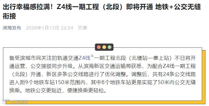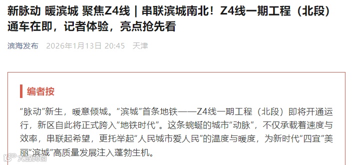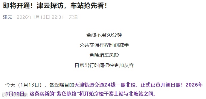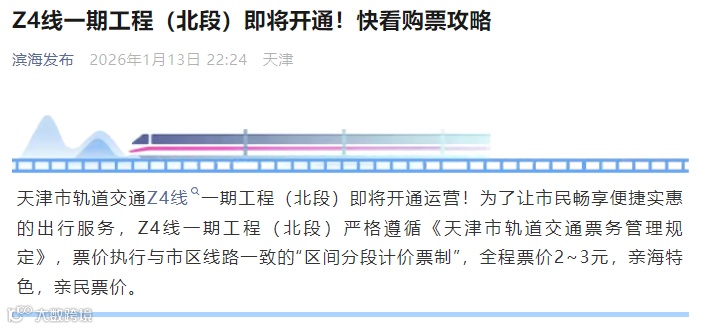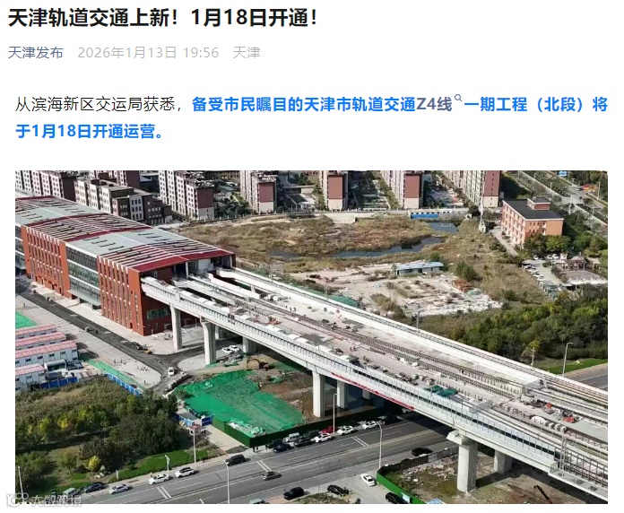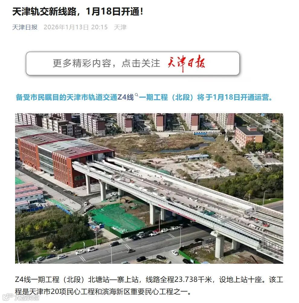 1月13日,备受瞩目的天津轨道交通Z4线一期北段,正式官宣开通日期!2026年1月18日,这条崭新的“紫色脉络”将开始穿梭于寨上站与北塘站之间。