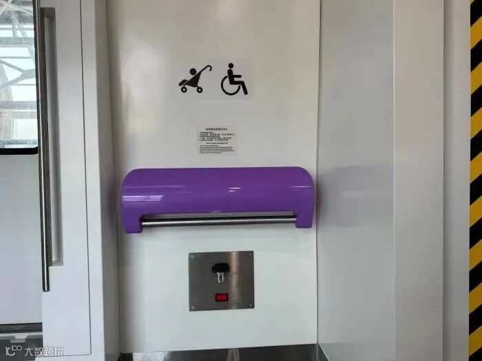 乘坐电梯抵达站台,就能看到紫色的列车正平稳停靠在轨道上等候乘客登车,灵动线条贯穿全身,科技感十足,其最高运营速度可达120km/h,跨区通勤效率拉满。