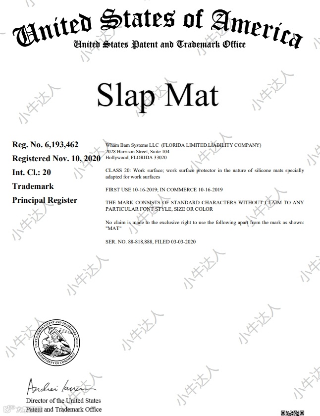 涉案商标“Slap Mat”在2020年11月10日下证,商标注册类目为家具类,而产品服务范围是:硅胶材质的工作保护垫。