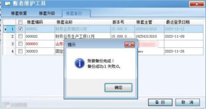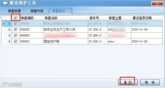 2 、勾选需要年结的账套,点击备份,路径选择 D 盘-中为数科-手工备份文件夹;