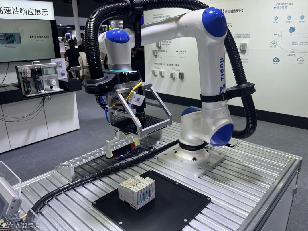 展台的环形展区,矩控新辰的AI边缘智能控制器MX6000,携手天机协作机器人正在上演一场工业级仿生秀,这无疑是本次展会的一大亮点。在模拟IO模块智能产线中,视觉系统如同“慧眼”,迅速完成模块尺寸、位置及装配状态的三维建模;MX6000则化身“智慧中枢”,通过边缘计算即时规划最优路径,完美完成抓取、分拣、配送等复杂任务,整个流程行云流水。这一创新应用全栈展示了“感知-决策-执行”的全链路智能协同。现场观众此起彼伏的快门声与赞叹声,成为该展区最生动的注脚,同时也充分彰显了矩控新辰在AI工业控制领域的技术实力与创新能力。