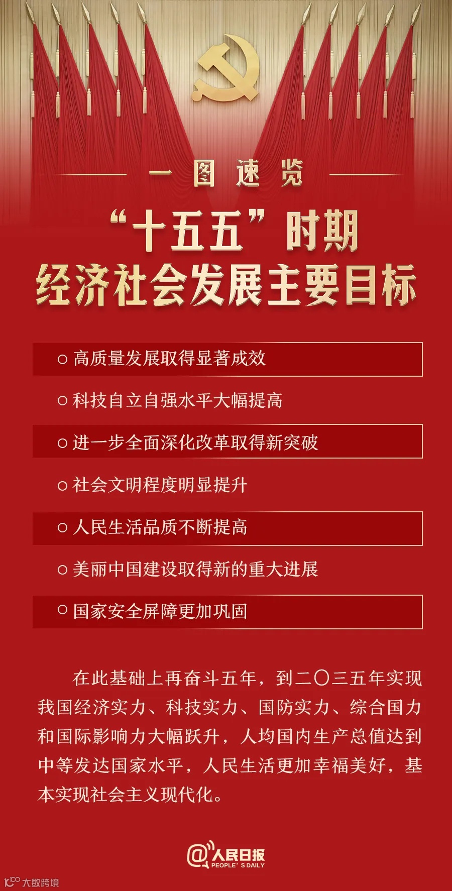 在此基础上再奋斗五年,到二〇三五年实现我国经济实力、科技实力、国防实力、综合国力和国际影响力大幅跃升,人均国内生产总值达到中等发达国家水平,人民生活更加幸福美好,基本实现社会主义现代化。